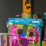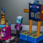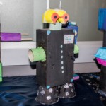 Wir sammelten viel Müll. Dann ging es auch schon los: Wir bastelten mit Kleber, Schere und dem Müll. Manchmal benutzte Frau Wörner auch die Heißklebepistole. Es entstand ein großes Tohuwabohu. Wir werkelten tagelang und bauten viele Roboter. Schließlich malten wir sie noch an.