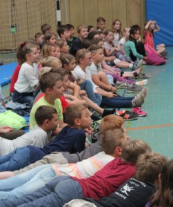 Um 9.40 Uhr ging es los. Die Sporthalle füllte sich mit Grundschülern von der Klassenstufe 1 bis 4 mit den Lehrerinnen und Lehrern. Frau Wörner organisierte das ganze Treiben und begrüßte uns.